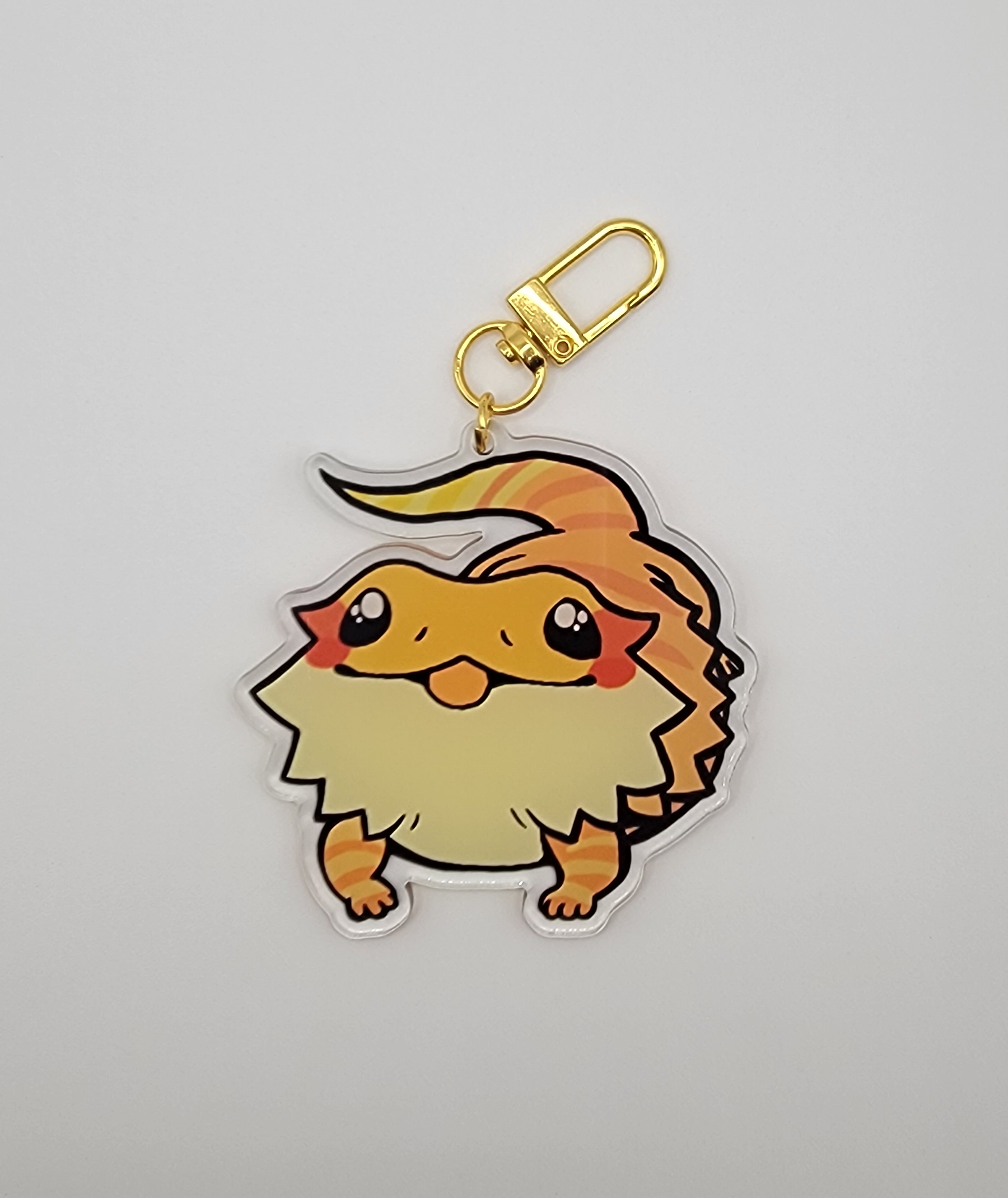 Carry a little charm with you everywhere with this playful chibi bearded dragon keychain. It's cute, compact design adds a fun touch to your keys or bag, making it a perfect gift for reptile lovers or anyone who enjoys quirky accessories. Durable and lightweight, it’s an adorable way to keep your essentials together with a smile. Material is acrylic.